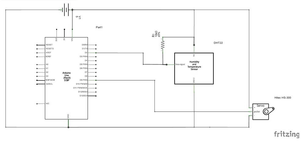 As it said, this easy solution was designed to open and close automatically the window. To make this were installed a sensor and a servo-motor. The first one obtains temperature values and, in function of Arduino code, the second one opens or closes the window.